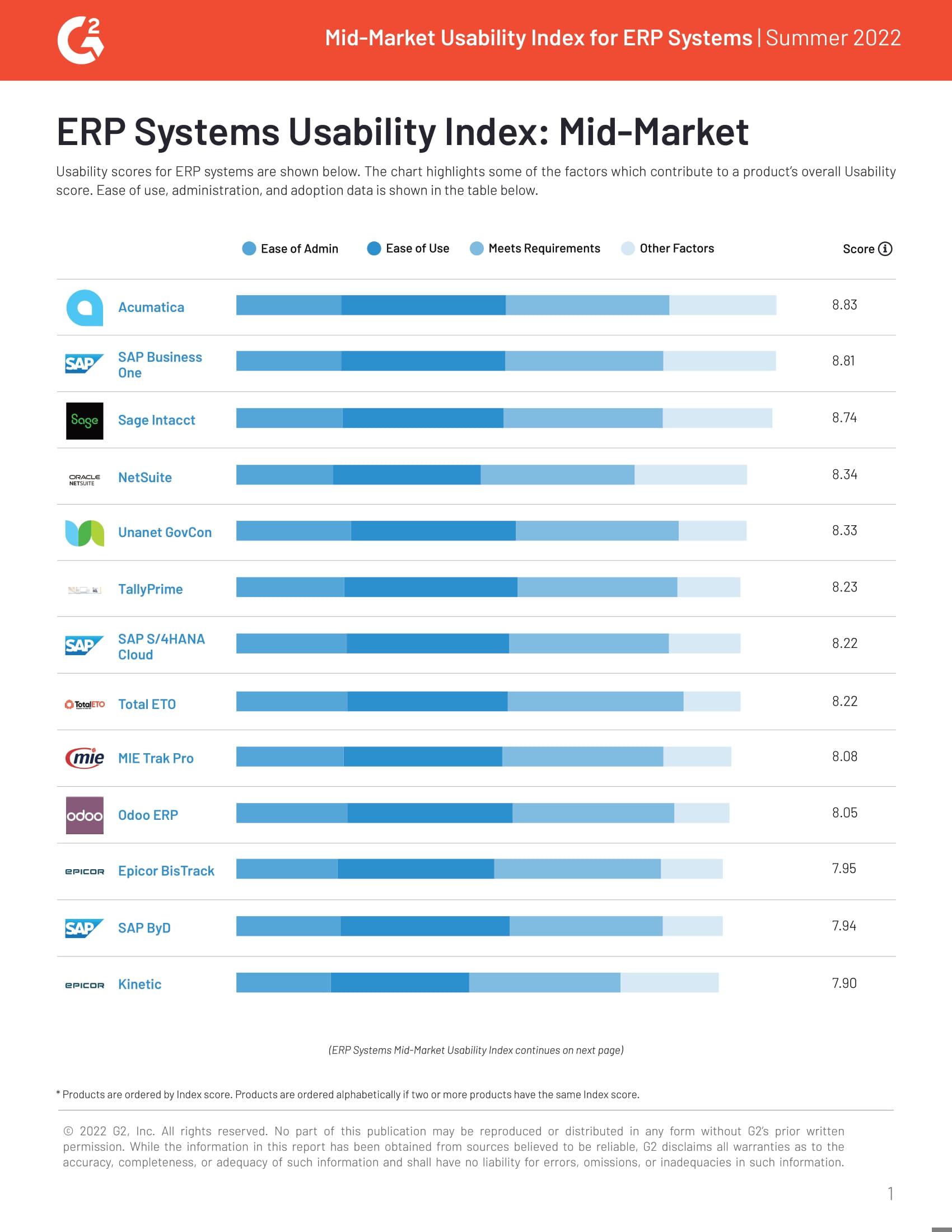 This report by G2 provides product usability profiles for Acumatica and 33 other ERP systems, which includes scores for: